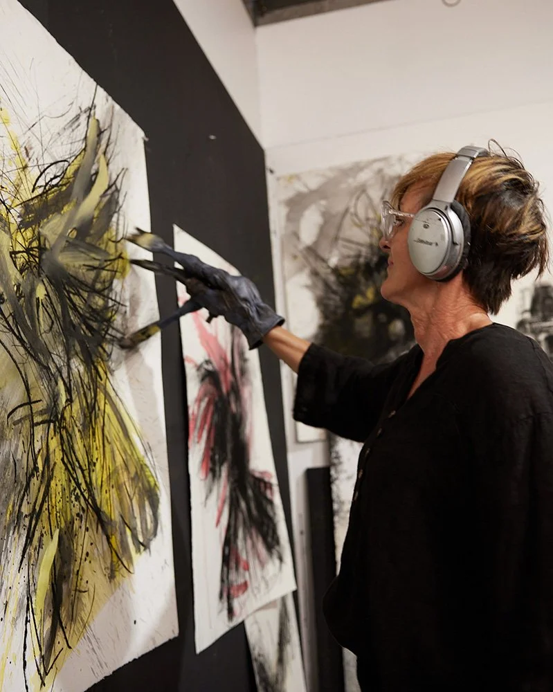 “My life is enriched by unexpected encounters with wild creatures that drop in randomly when they want. I draw with gloves I invented while listening to recorded bird noises. I do this, so my drawing movements respond to the calls I am hearing. My aim is to capture the energy I feel, see and hear connected to Australian birdlife.”