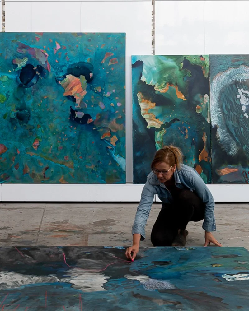 Her paintings are layered with pigment and texture, evoking a feminine sensibility within an often unforgiving environment. “While others see harshness and danger,” she says, “I see a soft beauty in the landscape — a strange unfolding of ephemeral and permanent marks.” Her work reflects a deep environmental awareness and a personal philosophy of strength through softness — treading lightly while maintaining a clear purpose.