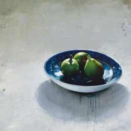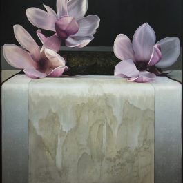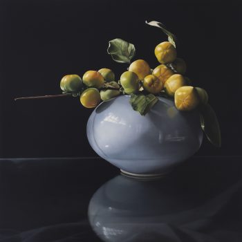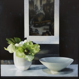 Julie Davidson’s beautiful still life oil paintings are an investigation of pictorial tradition and the relationship between interior and exterior on a two dimensional surface.“(A) source of inspiration is Jan Vermeer, the Dutch baroque painter of intimate domestic interiors. As in Vermeer’s quiet, contemplative scenes, light falls upon objects from some unseen source, submerging other parts of the painting in warm shadows.” Julie Davidson