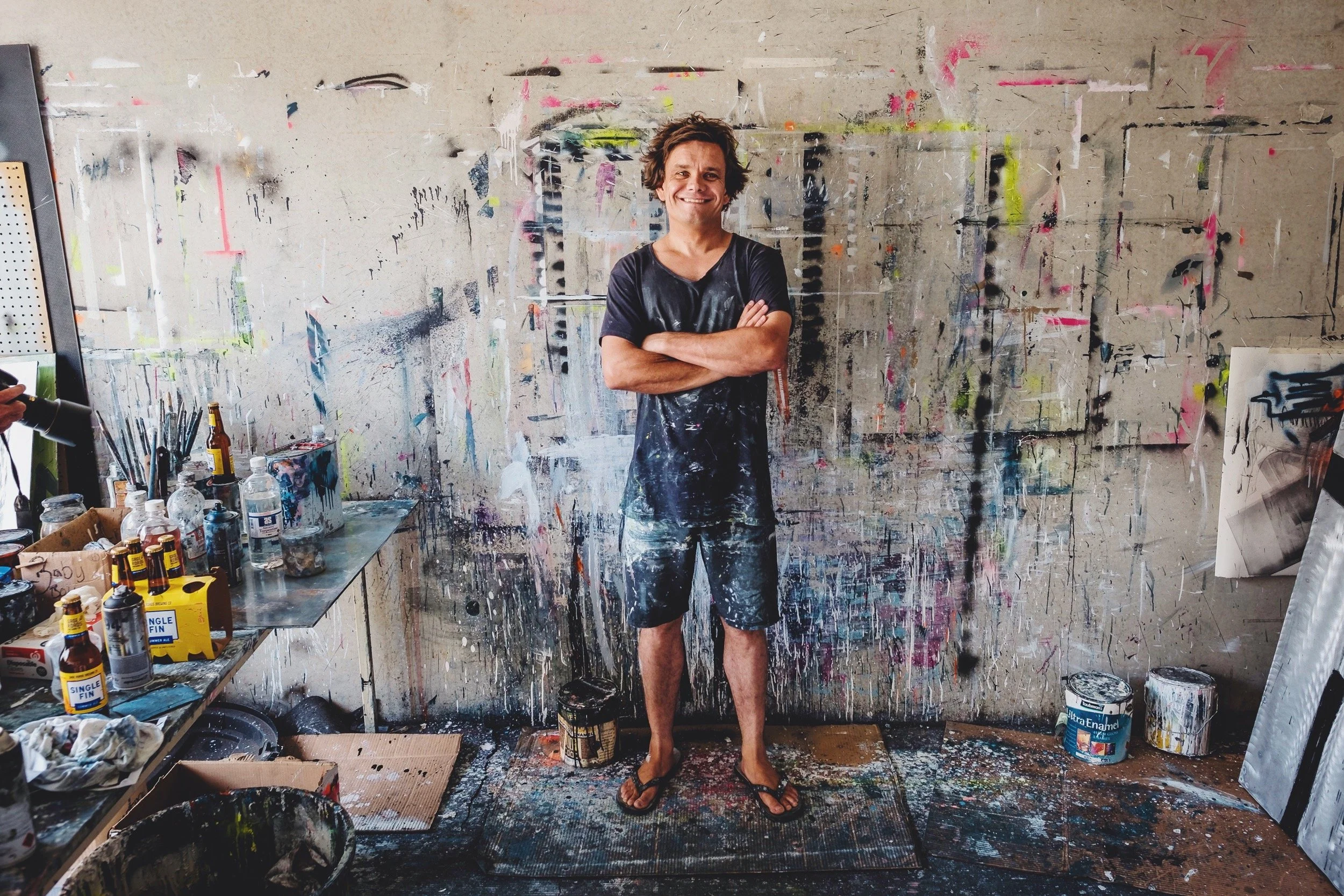Andy Quilty is a multidisciplinary artist based in Rockingham, Western Australia, whose work explores themes of masculinity, class, crime, and suburban identity. Working with materials such as ballpoint pen, auto enamel, aerosol paint, and even burnout marks from vehicles, Quilty draws on the visual language of outer-suburban Australia to create raw, expressive pieces. His practice is deeply rooted in personal and cultural narratives, often reflecting on his own experiences growing up in Perth’s southern suburbs. He completed his Master of Fine Arts by Research at the University of Western Australia, with a focus on the aesthetics and stereotypes of the Australian outer suburbs.