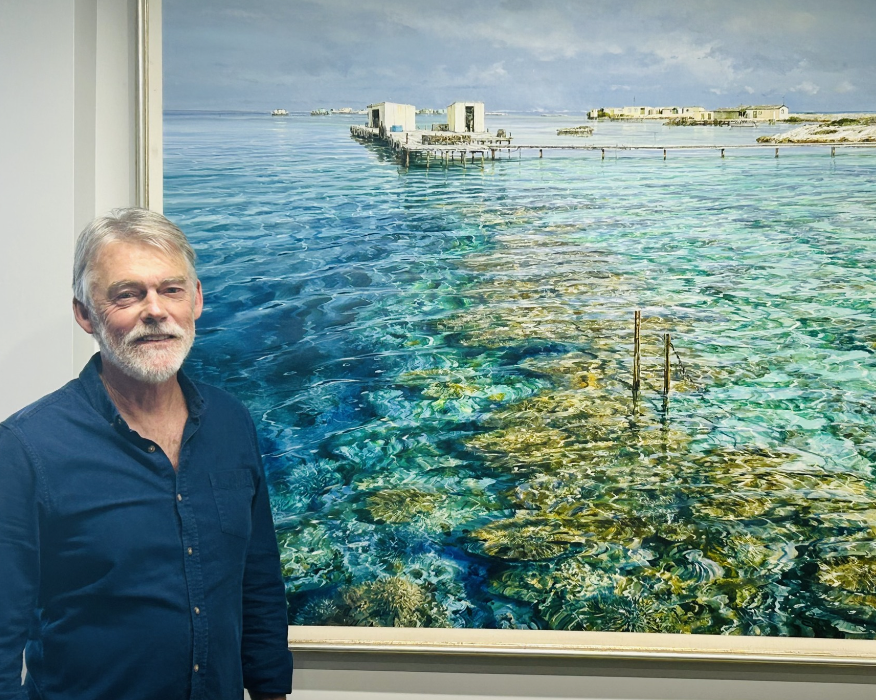 Larry Mitchell is a renowned Western Australian painter celebrated for his luminous, large-scale depictions of coastal and ocean environments. Based in Fremantle, Mitchell has spent decades documenting fragile marine landscapes, particularly in the Abrolhos Islands, the Kimberley coast, and remote South Pacific atolls. His meticulous, realist style combines rich colour, atmospheric light, and a deep sense of place, capturing both the beauty and vulnerability of these environments. Working from extensive on-site research, sketches, and photographs, Mitchell’s paintings serve as both visual records and environmental commentaries, highlighting the impact of climate change and human activity on delicate ecosystems. His work is represented in major public, corporate, and private collections, and he remains an influential voice in Australian contemporary landscape painting.