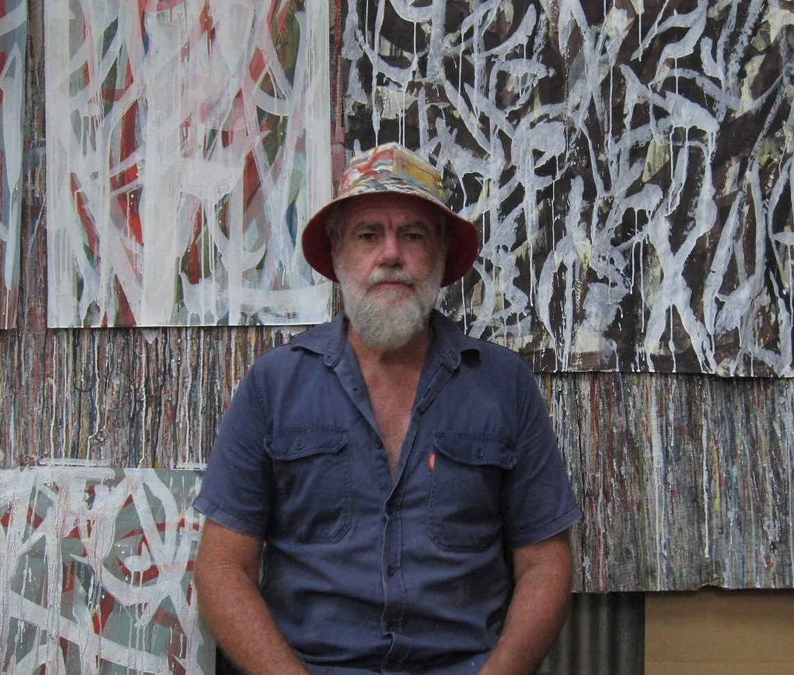 Robert Moore is an Australian artist known for his vibrant, pattern-driven paintings that blend the personal with the architectural and ecological. Based in the Clarence Valley in northern New South Wales, Moore maintains a rigorous daily studio practice that has sustained his career since the 1980s. He rose to prominence through his work with the iconic Australian lifestyle brand Mambo in the 1990s and 2000s, and continues to be a creative force today as a contributor to the global label Deus Ex Machina. His art appears on surfboards, garments, and installations around the world, while his studio work spans everything from small, intimate canvases to expansive multi-panel compositions. Moore’s paintings often incorporate typography, numbers, and repeated forms—visual rhythms that echo both human-made environments and the biodiversity of regional Australia.