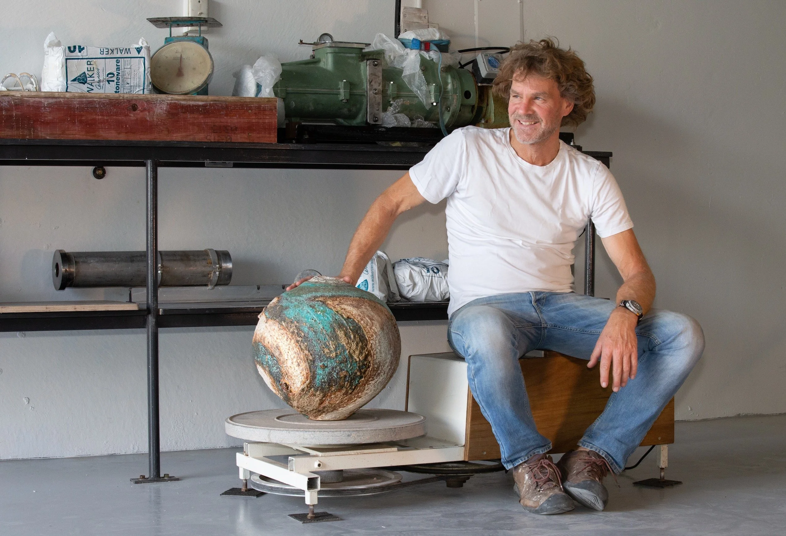 Warrick Palmateer is a distinguished studio potter and art educator, widely regarded as one of Australia’s finest porcelain throwers. He is internationally recognised for his long-standing collaboration with acclaimed ceramic artist Pippin Drysdale, creating the porcelain vessels that underpin her iconic mineral-inspired works. Alongside this, Palmateer has forged a celebrated independent practice, producing monumental wheel-thrown and coiled vessels whose surfaces bear impressions of coastal rock, fossils, and shells—capturing the light, movement, and textures of the rugged Southwest Australian coast.