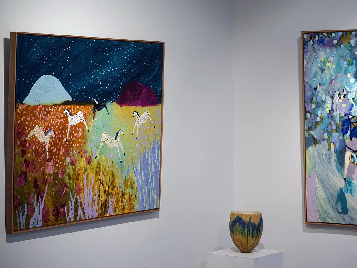 The exhibition moves between structure and atmosphere. Linear compositions and defined forms are softened by a more reflective, almost dreamlike quality, echoing the shift in light as days shorten and evenings settle in. Colour is present but tempered, less about intensity, more about nuance and quiet variation.