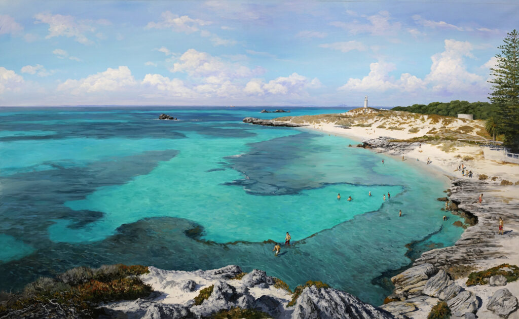 Celebrating one of Western Australia’s most beloved beach destinations, Leigh Hewson-Bower explores the interplay of shadows and light across Rottnest Island. His vivid depictions of the shimmering turquoise waters capture not only Rottnest’s clarity and beauty, but also the memories we share with family and friends and the timeless joy of summers on the island.